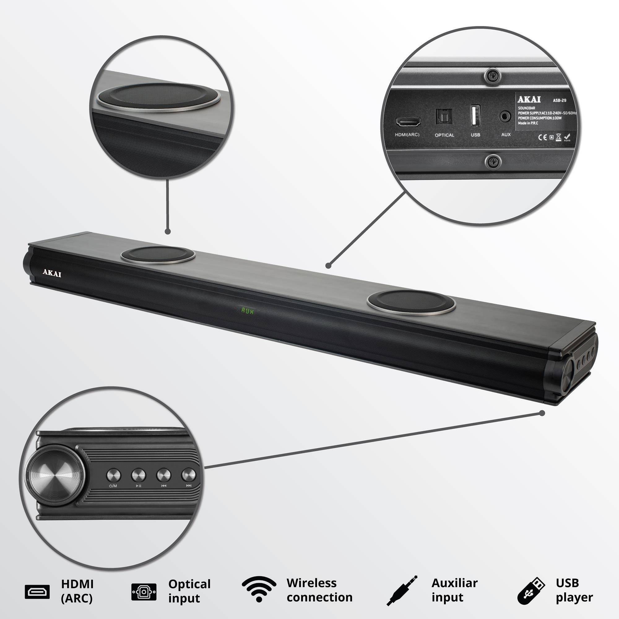 Akai ASB-29 Soundbar με Bluetooth, USB, Aux-In, οπτική ίνα και HDMI Soundbar